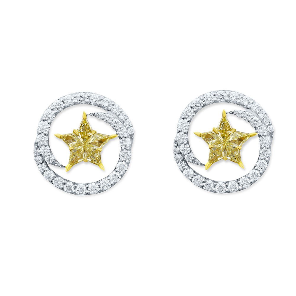 A Most Desired Jewelry of any Women is a Stud Earring which will Empower her Inner Strength with it's Charmness. This Earring Stud Crafted in 18K White Gold having Star Shape LookaLike Solitaire By Combining 5 different Piece of, FLY Color, Yellow Diamonds stogather and Express the strength of Unity. Each Earring Having Star Shaped LookaLike Solitaire of 0.31 carat and 0.33 Carat Respectively.