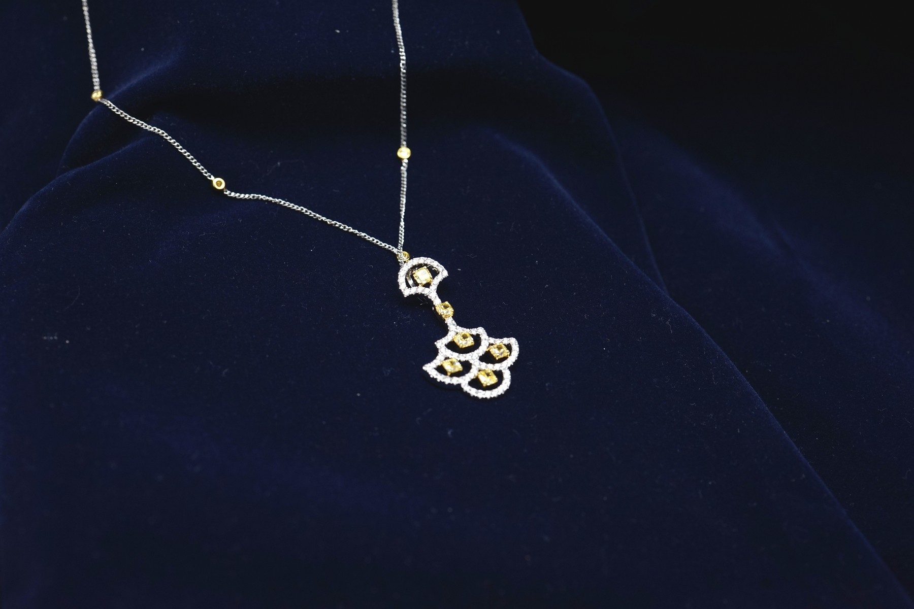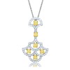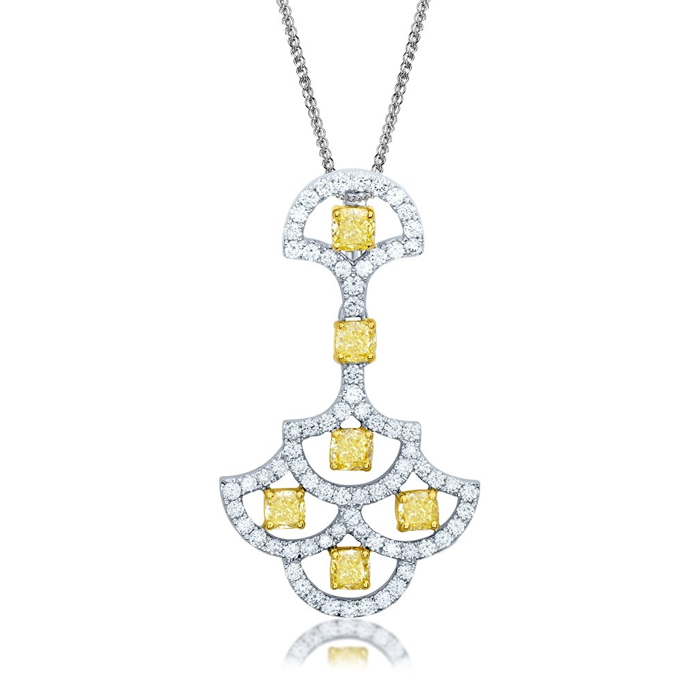 A Magnificent pendant features Cushion Shaped Natural Light Diamonds of 0.165 Cts Each with Total Weight of 0.99 cts. Perfectly Balanced Elemets Crafted in White Gold. This Pendant will be The Center of Attraction in your Next Gathering. The White Round Diamonds Pave sets on The Edges of this Pendant adds Charm to its Look.